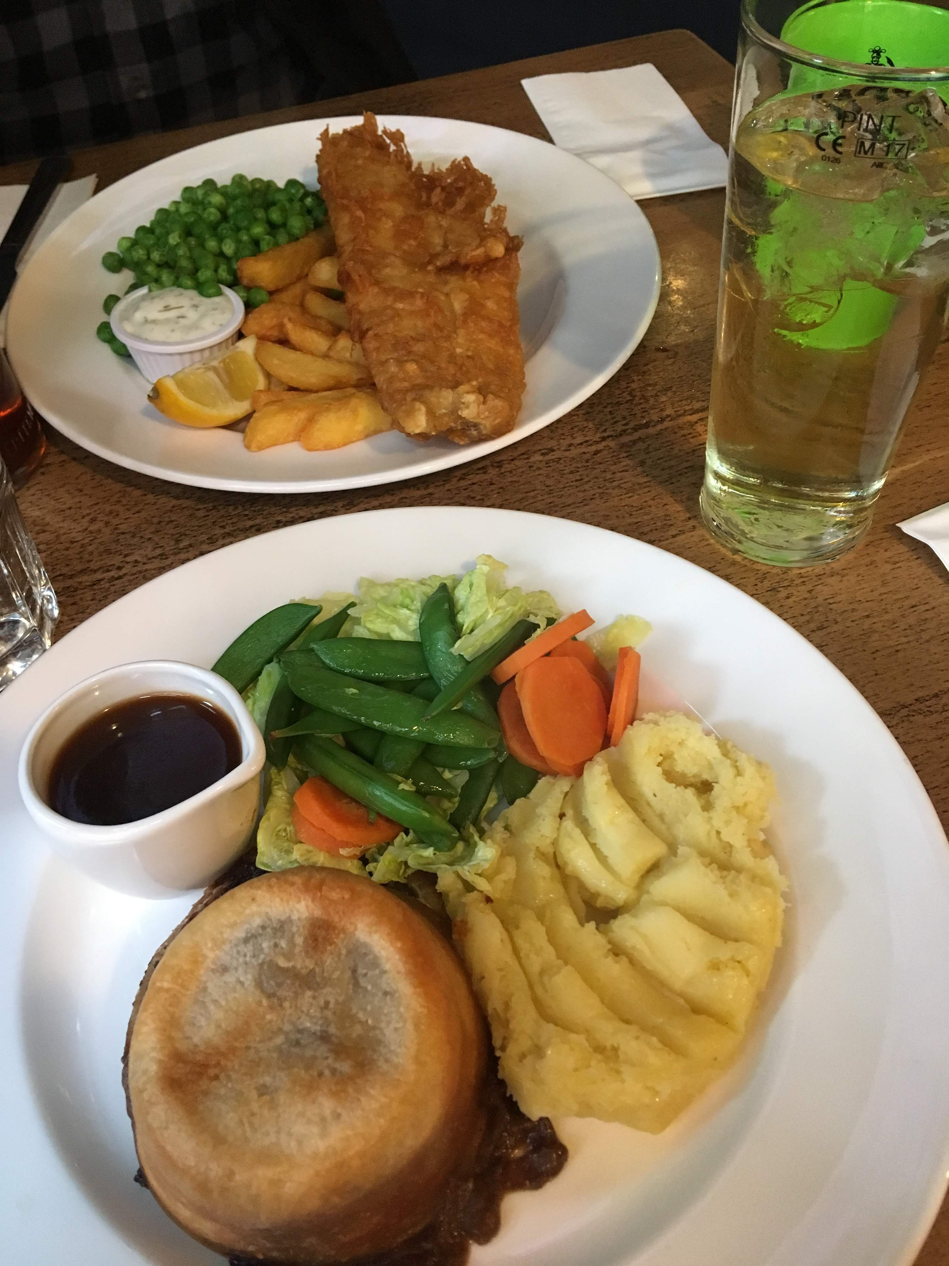 Took another 45 minutes to get to downtown London. Took some looking, but found a British pub and had some great fish and chips (fries) and a steak and kidney pudding pie. So good! Every cuisine imaginable is offered in London!