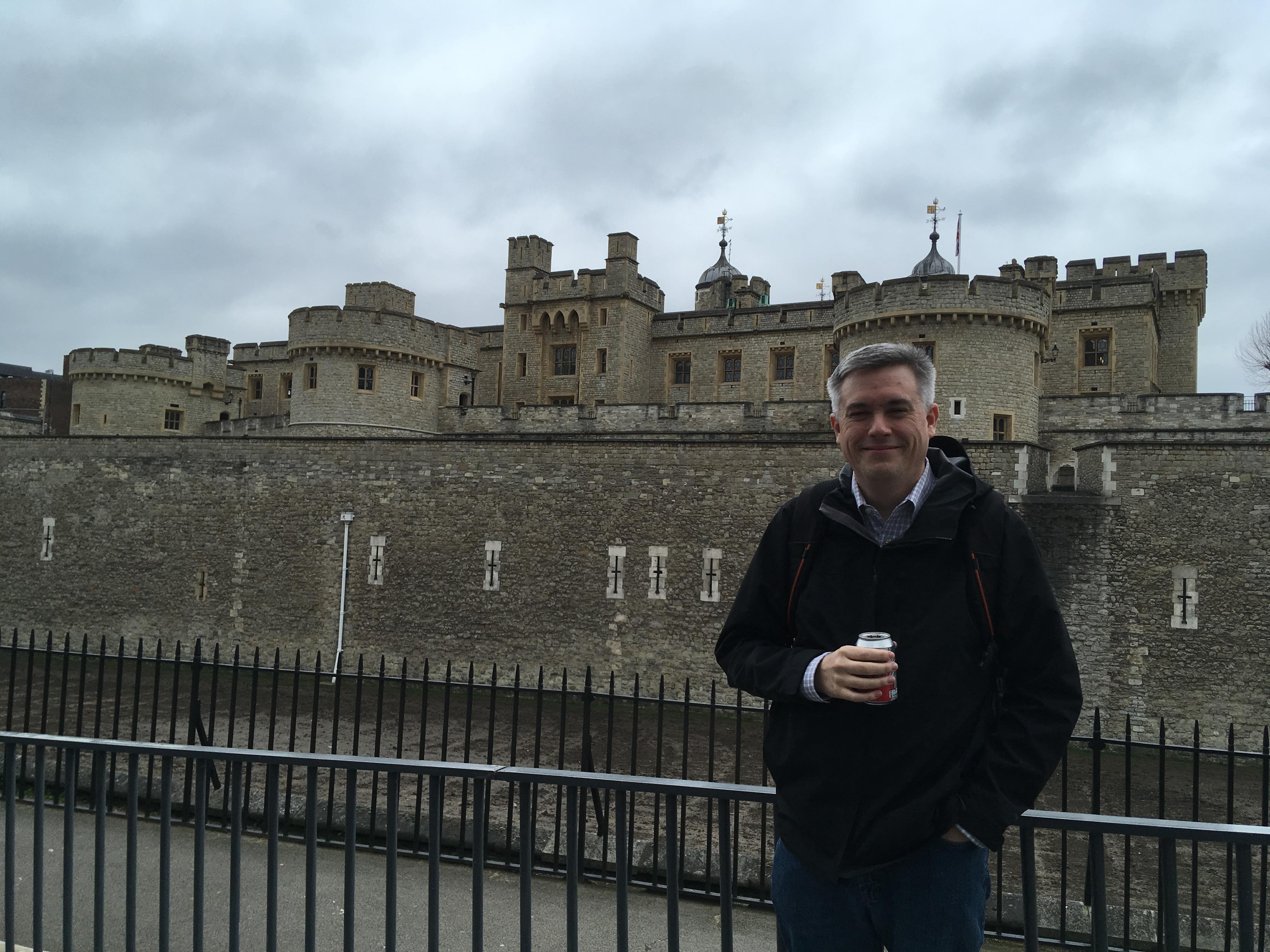 We get breakfast from the hotel (food is similar to american hotel breakfast buffett, except in the UK they like to have baked beans with breakfast). Take the 1 hr bus/train ride into central London. Grab a bacon roll (bun with salty ham).